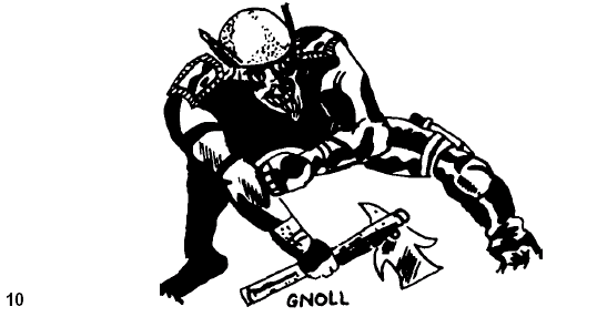 GNOLLS: A cross between Gnomes and Trolls (... perhaps, Lord Sunsany did not really make it all that clear) with +2 morale. Otherwise they are similar to Hobgoblins, although the Gnoll king and his bodyguard of from 1 - 4 will fight as Trolls but lack regenerative power. - Dungeons & Dragons, volume II: Monsters & Treasure by Gary Gygax and Dave ArnesonThere's an obvious misspelling in the description above; it is clearly a reference to Lord Dunsany, as Edward Plunkett published his pioneering fantasy stories. Dunsany didn't actually describe gnoles in the story "How Nuth Would Have Practiced His Art upon the Gnoles" but Margaret St. Clair does in her story, referencing the same creatures, "The Man Who Sold Rope to the Gnoles." They are described as looking like a Jerusalem artichoke made of India rubber, with a long thin tongue, a mouth full of fangs, and eyes which are multi-faceted rubies. The unfortunate salesman of St. Clair's story takes the spare eyes of the senior gnole and is enveloped in its network of tentacles (!), fattened, roasted and eaten - but not tortured.