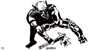 Fully fleshed out, gnolls become hyena-men. It's a classic sort of D&D-ism, and like most of them, I like it while considering it a bit tired. In a previous post, I talked about orcs taking up this role, although I'm now considering doing it the other way, making pig-man orcs into a special instance of a much larger category of beastmen. This will absorb the AD&D style of gnoll as well, increasing hit dice and so on so that your hyena-men are for all intents and purposes the basic gnoll.